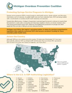As harm-reduction hubs, SSPs connect people with comprehensive care and substance abuse treatment, provide clean needles, and offer a place for needle exchange to reduce syringe litter and needlestick injuries. Syringes and other equipment provided by public health programs are not classified as drug paraphernalia under state law; however, many Michigan communities criminalize their possession without exemptions for public health services. This means that public health workers and program participants can face arrest and prosecution for legally distributing (or obtaining) life-saving materials in one jurisdiction that are prohibited in another. SSP staff, participants, and persons attempting to discard used needles safely can face criminal charges for activities that protect public health.